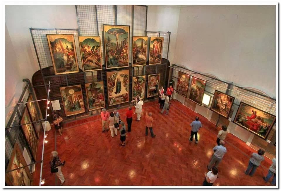 As deslumbrantes pinturas do retábulo quinhentista (*), produzido entre 1519 e 1530, foram dispostas em dois planos (ver foto) numa montagem aproximada ao que seria a sua colocação original em três alturas na capela-mor da Igreja de Jesus de Setúbal. Ocupam o espaço mais nobre e amplo das instalações do antigo Banco, agora galeria municipal, com acesso a partir da avenida Luisa Todi. A sua contemplação é obrigatória nesta visita, quase nos deixando sem fôlego!